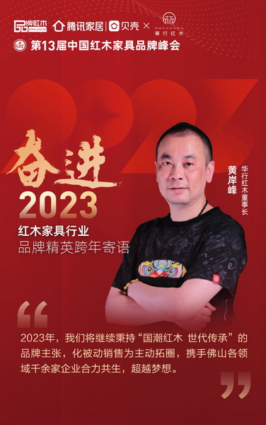 黃岸峰董事長受邀為品牌寄語:2023年,華行紅木將繼續秉持“國潮紅木 世代傳承”的品牌主張,化被動銷售為主動破圈,攜手佛山各領域千余家企業合力共生,超越夢想。