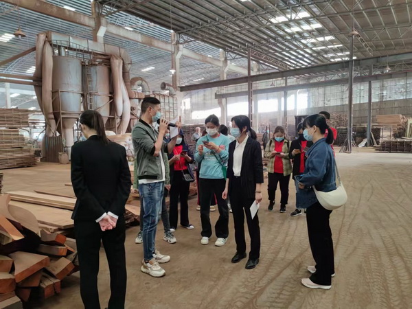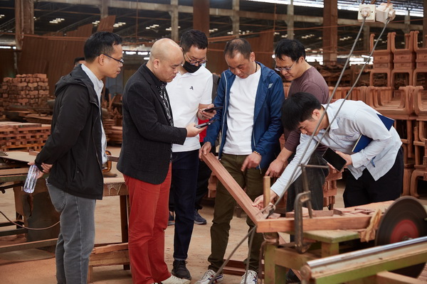 在黃岸峰董事長的帶領下,華行紅木營銷服務團隊走進總部工廠,實地深入了解紅木家具的制作工序流程,并對新一年提升產品工藝品質提出要求。