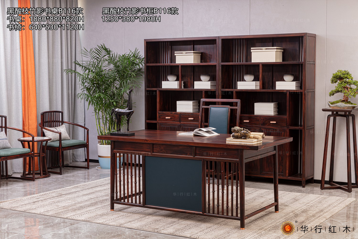 黑酸枝竹影書桌B116款+黑酸枝竹影書柜B116款圖片及家具信息